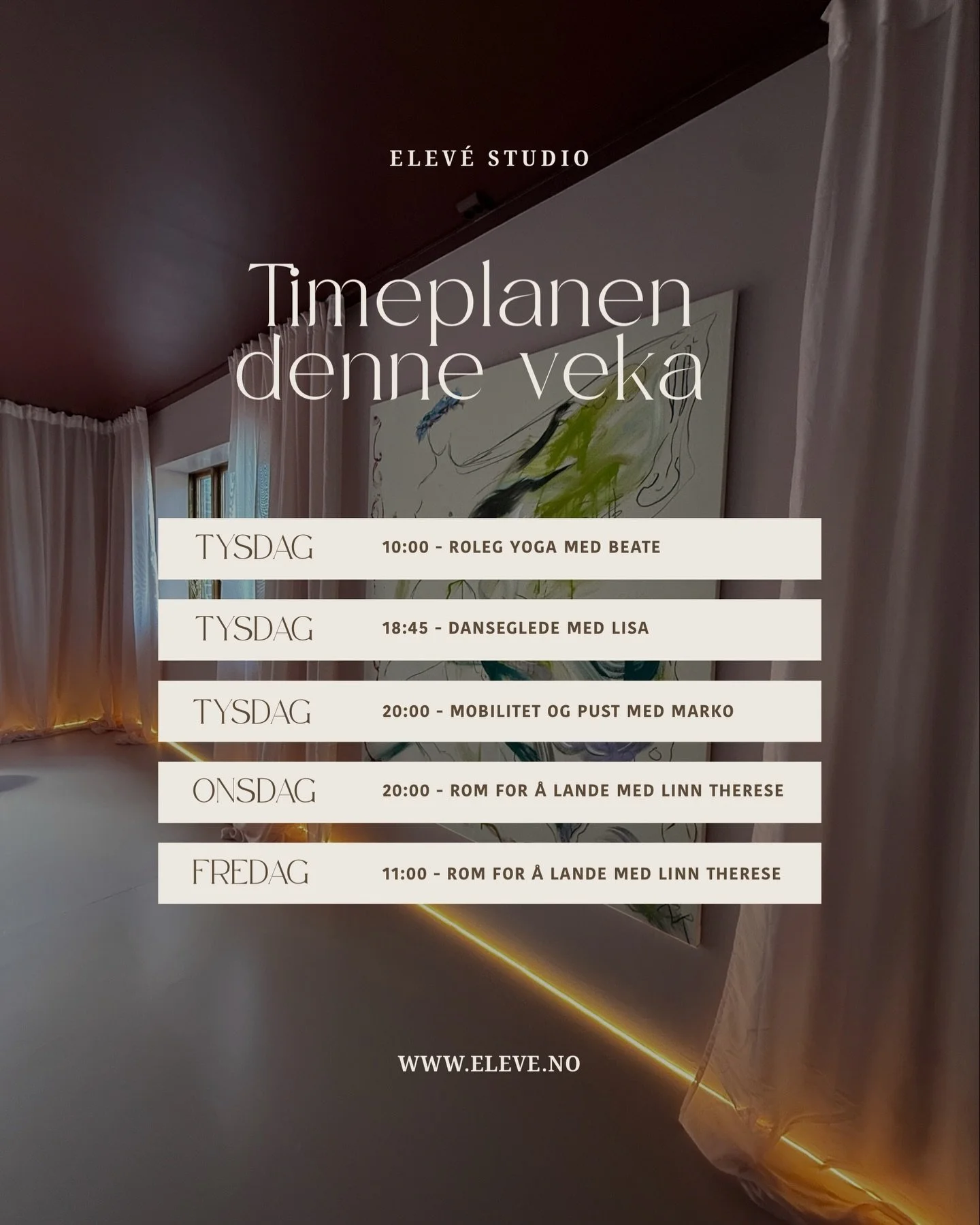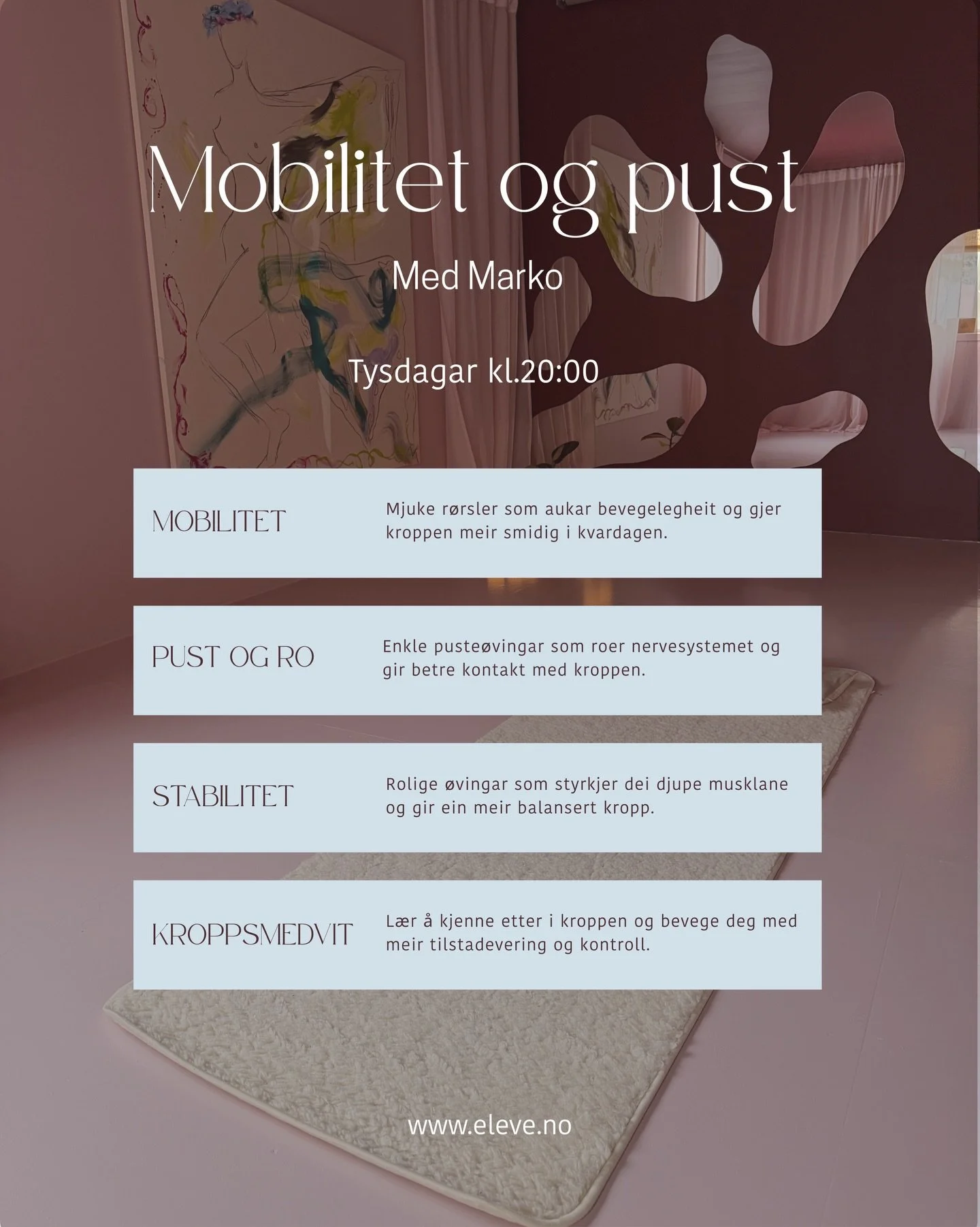 Elevé Kollektivet tilbyr gruppetimar i yoga, meditasjon – eit pusterom der du kan senke tempoet, fylle på energi og styrke både kropp og sinn.